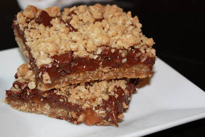 Stir until crumbs are the size of corn. Press 2/3 of mixture in the bottom of a greased 9x13 pan. Bake at 350 for 10 minutes. Remove from oven and spoon on 1 1/4 cups of Carmel sauce. (make your own--1 bag caramels melted with 2/3 cup milk, or use jarred Mrs. Richardson's Butterscotch Caramel topping) Sprinkle on 2-2 1/2 cups chocolate chips (semi-sweet). Sprinkle remaining oat mixture over the top and return to the oven for 18 more minutes.